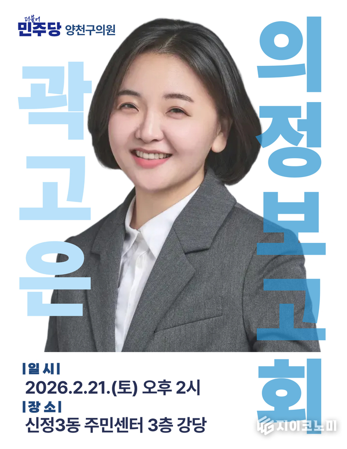 지이코노미 최영규 기자 | 양천구의회 곽고은 의원(더불어민주당, 비례대표)이 오는 21일(토) 오후 2시 양천구 신정3동 주민센터에서 의정보고회를 열어 그간의 의정활동 성과와 향후 계획을 양천구민께 보고하는 자리를 마련한다.