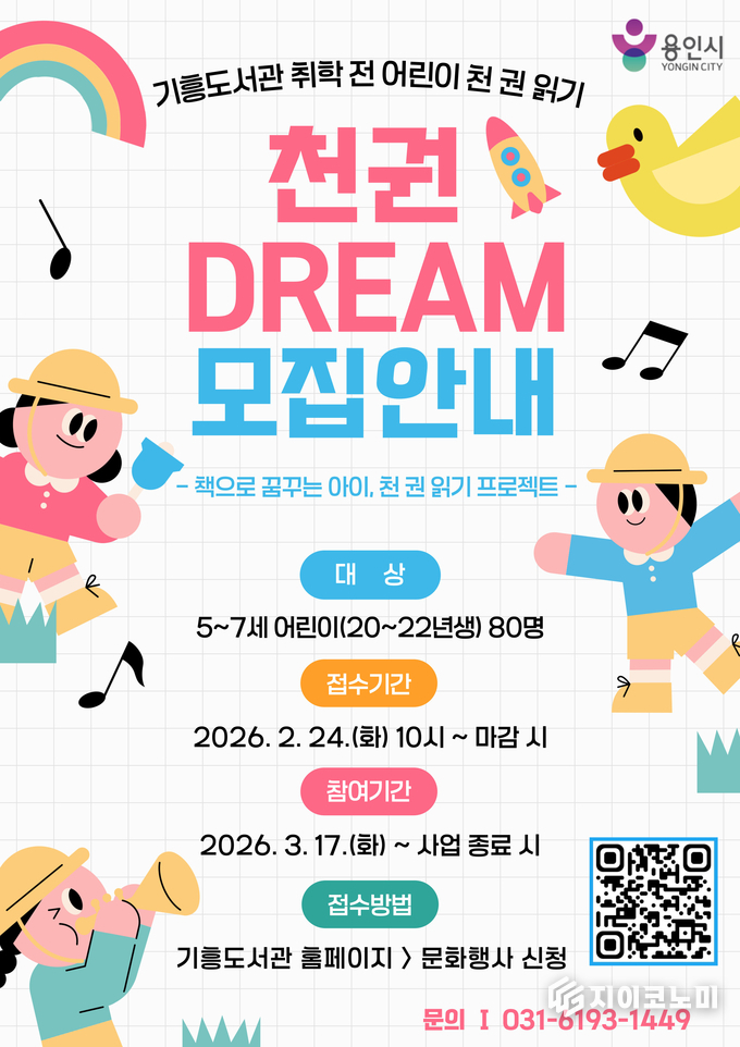 지이코노미 최영규 기자 | 용인특례시(시장 이상일)는 오는 24일부터 ‘어린이 천권 읽기, 천권DREAM’ 신규 참여자 80명을 모집한다고 11일 밝혔다.