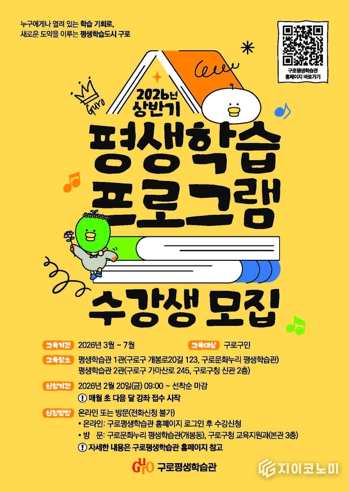 지이코노미 최영규 기자 | 구로구(구청장 장인홍)가 3월부터 7월까지 ‘2026년 상반기 평생학습 프로그램’을 운영한다.
