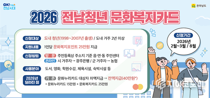 지이코노미 김정훈 기자 | 전라남도는 19∼28세 청년을 대상으로 ‘전남 청년 문화복지카드’ 신청을 3월 말까지 받는다고 24일 밝혔다.