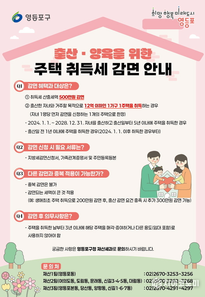 최호권 영등포구청장은 “이번 주택 취득세 감면 혜택이 출산 가구의 경제적 부담을 덜어주는 데 도움이 되기 기대한다”라며 “다양한 돌봄 지원 정책을 지속적으로 확대해 아이 키우기 좋은 영등포구 만들어 가겠다”라고 전했다.