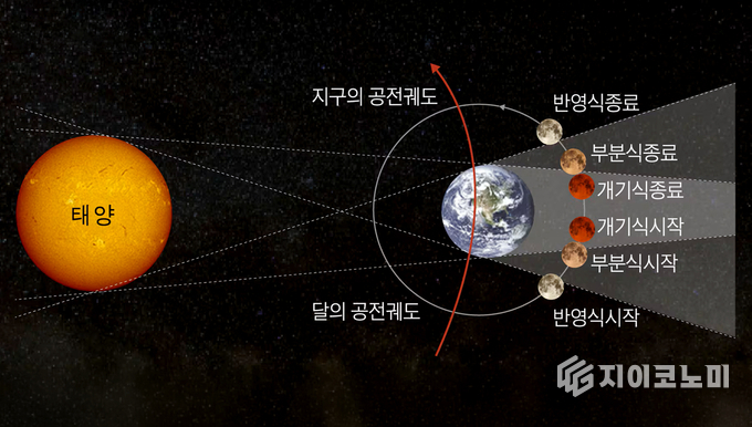 개기월식은 태양·지구·달이 일직선상에 놓이면서 달이 지구의 본그림자에 완전히 들어갈 때 나타나는 현상이다. 달은 완전히 사라지지 않고 지구 대기를 통과한 태양빛이 굴절되며 붉은빛을 띠게 된다.