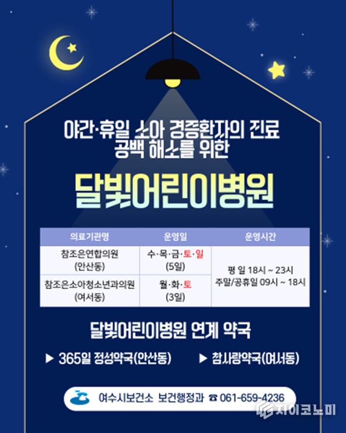 지이코노미 오명숙 기자 | 전남 여수시가 야간과 휴일 소아 진료 공백을 메우기 위한 ‘달빛어린이병원’ 운영에 들어갔다.