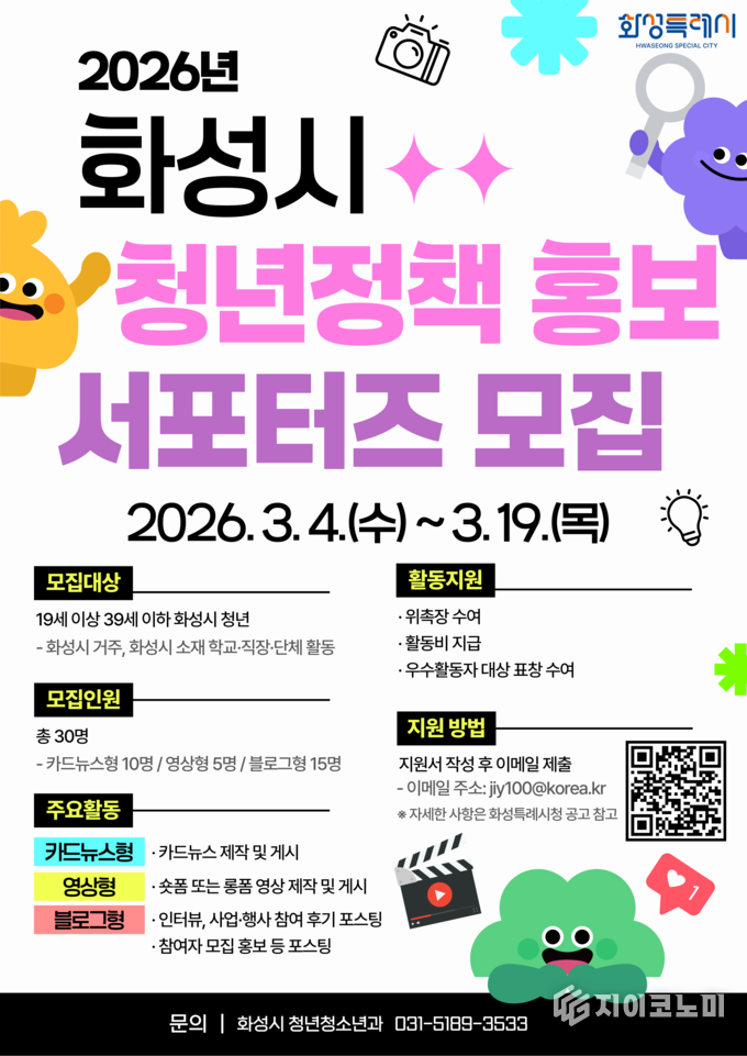 지이코노미 최영규 기자 | 화성특례시는 청년정책에 대한 이해를 돕고 정책 정보를 효과적으로 전달하기 위해 ‘2026년 화성시 청년정책 홍보 서포터즈’를 모집한다고 4일 밝혔다.