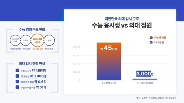 입시 경쟁 구조 역시 심화되는 흐름을 보이고 있다. 최근 수능 응시생 수는 약 45만 명 수준인 반면 전국 의과대학 정원은 약 3000명 수준으로 제한적인 구조다.