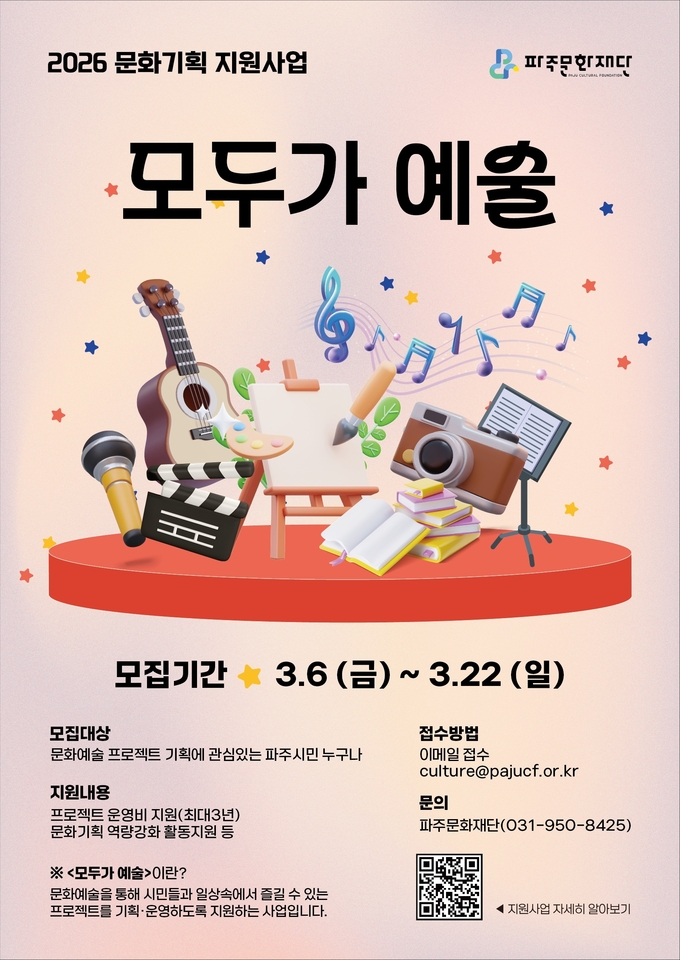 지이코노미 양하영 기자 | (재)파주문화재단(대표이사 김영준)이 시민들이 일상 속에서 문화를 향유하고 직접 기획할 수 있는 환경을 조성하기 위해 ‘2026 문화예술 지원사업’ 공모를 본격 추진한다.