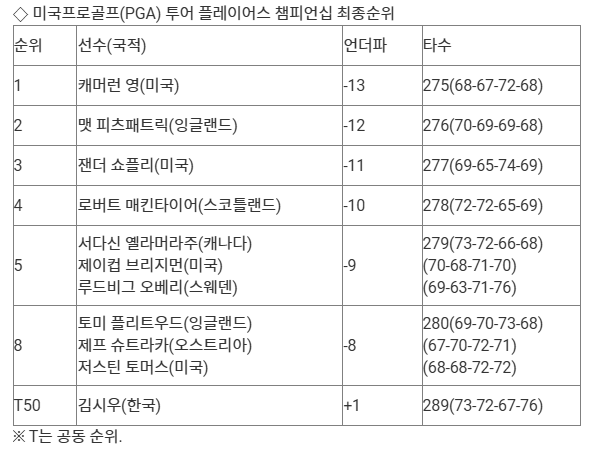 지난해 이 대회 우승자 로리 맥길로이(북아일랜드)는 이븐파 288타로 공동 46위, 2023년과 2024년 정상에 올랐던 스코티 세플러(미국)는 5언더파 283타 공동 22위에 올랐다.