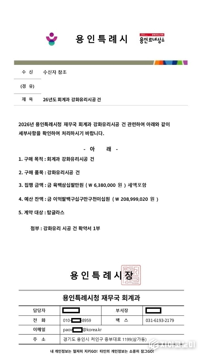 지이코노미 최영규 기자 | 용인특례시(시장 이상일)는 공공기관 직원을 사칭해 업체로부터 대금을 챙기거나 선결제를 유도하는 사기 사건이 발생하자 각별한 주의를 당부하며 피해 예방을 위해 행정력을 집중하고 있다고 17일 밝혔다.