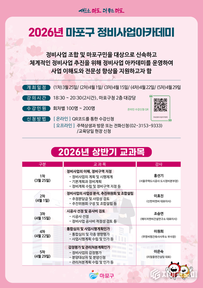 지이코노미 최영규 기자 | 마포구(구청장 박강수)는 지역 내 정비사업 조합과 주민을 대상으로 ‘2026년 상반기 마포구 정비사업 아카데미’를 3월 25일부터 4월 29일까지 총 5회차에 걸쳐 개최한다.