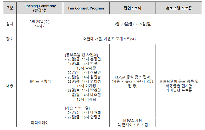 팬들을 위한 이벤트는 행사 기간 내내 이어진다. ‘홍보모델 팬 사인회’를 열어 골프 팬과 고객들을 직접 만날 계획이고, KLPGA투어 출신 선수들에게 레슨을 받을 수 있는 ‘레슨 프로그램’도 운영한다.