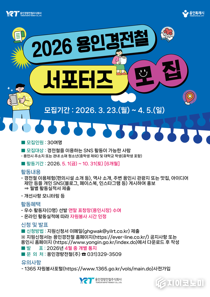 지이코노미 최영규 기자 | 용인특례시(시장 이상일)는 4월 5일까지 용인의 대표적인 철도인 용인경전철을 활성화하고자 ‘용인경전철 서포터즈’를 모집한다고 23일 밝혔다.