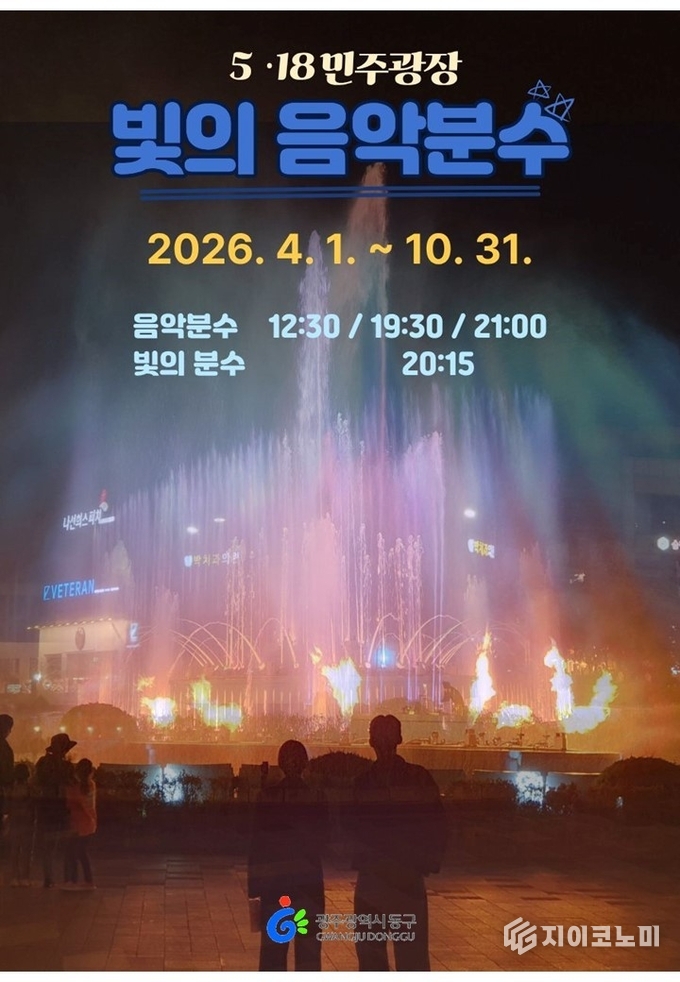 지이코노미 한정완 기자 | 광주광역시 동구가 시민과 관광객을 위한 새로운 야간 문화 콘텐츠를 선보인다. 빛과 음악이 어우러진 ‘빛의 음악분수’가 4월부터 10월까지 5·18민주광장에서 운영된다.