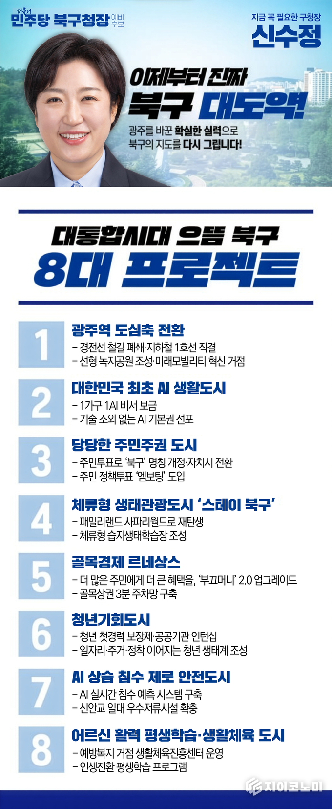 지이코노미 김정훈 기자 | 신수정 광주 북구청장 예비후보가 5일 ‘북구 대도약 8대 프로젝트’를 공개하며 도시 전반의 틀을 손보겠다는 밑그림을 내놨다.
