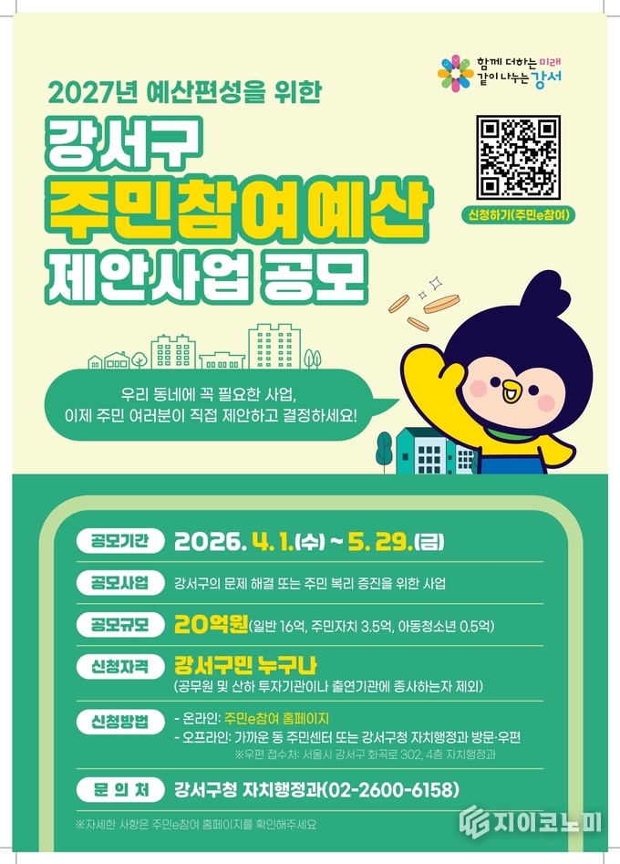 지이코노미 최영규 기자 | 서울 강서구(구청장 진교훈)는 내년도 예산에 반영할 ‘주민참여예산 제안사업’ 공모를 오는 5월 29일까지 진행한다.