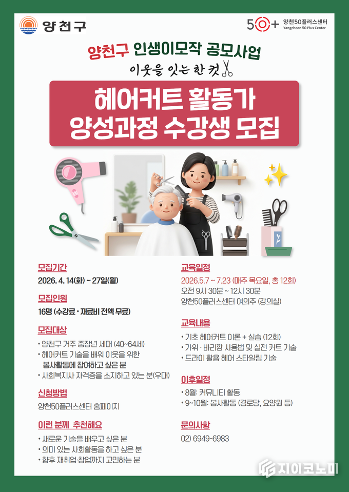 지이코노미 최영규 기자 | 양천50플러스센터(센터장 이수옥)가 중장년층의 사회참여 확대와 재능나눔 활동가 양성을 위해 「헤어커트 활동가 양성과정」을 개설하고 참여자를 모집한다.