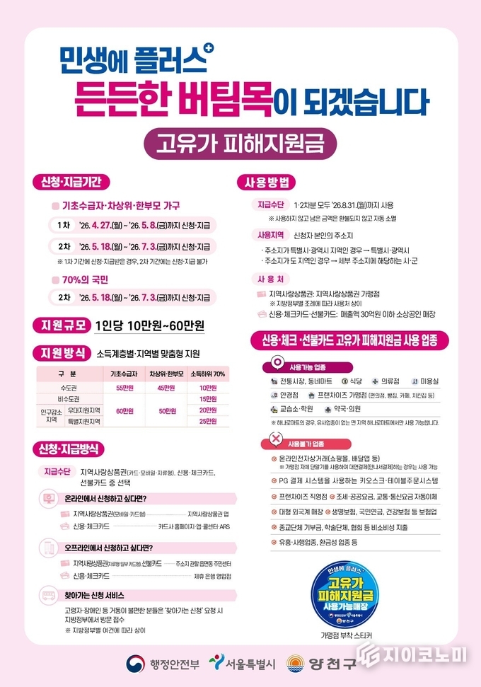 지이코노미 최영규 기자 | 양천구가 중동 전쟁에 따른 고유가·고물가로 어려움을 겪는 구민의 경제적 부담을 완화하기 위해 ‘고유가 피해지원금’ 전담 추진단을 구성하고 27일부터 지급 절차를 시작한다고 밝혔다.