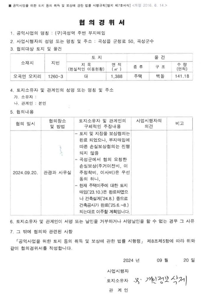 군은 입장문과 함께 구 곡성역 주변 부지매입 과정에서 작성된 협의경위서를 근거 자료로 제시하며 장기 거주와 이른바 ‘백지 계약서’ 의혹은 사실과 다르다고 했다. 해명에 그치지 않고 보상 협의 과정이 담긴 문서를 공개하며 사실관계 설명에 나선 점도 눈길을 끈다.