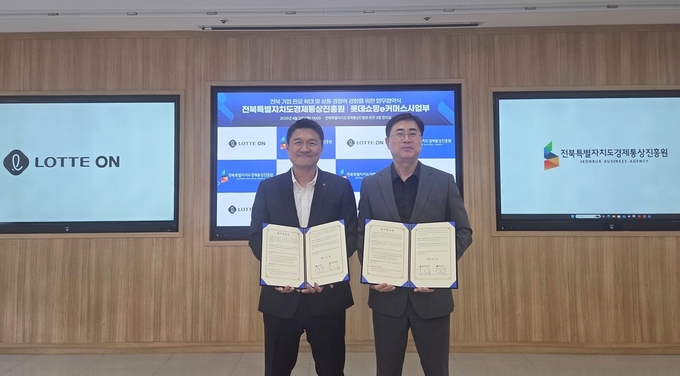 롯데온은 지난 28일 전북경진원과 업무협약(MOU)을 체결하고, 전북 지역 셀러들의 입점부터 마케팅까지 전 과정을 지원하는 협력 체계를 구축했다고 밝혔다. 이번 협약식에는 김장훈 롯데쇼핑 e커머스부문 상품부문 상무와 윤여봉 전북경진원장 등 양측 주요 관계자들이 참석했다.