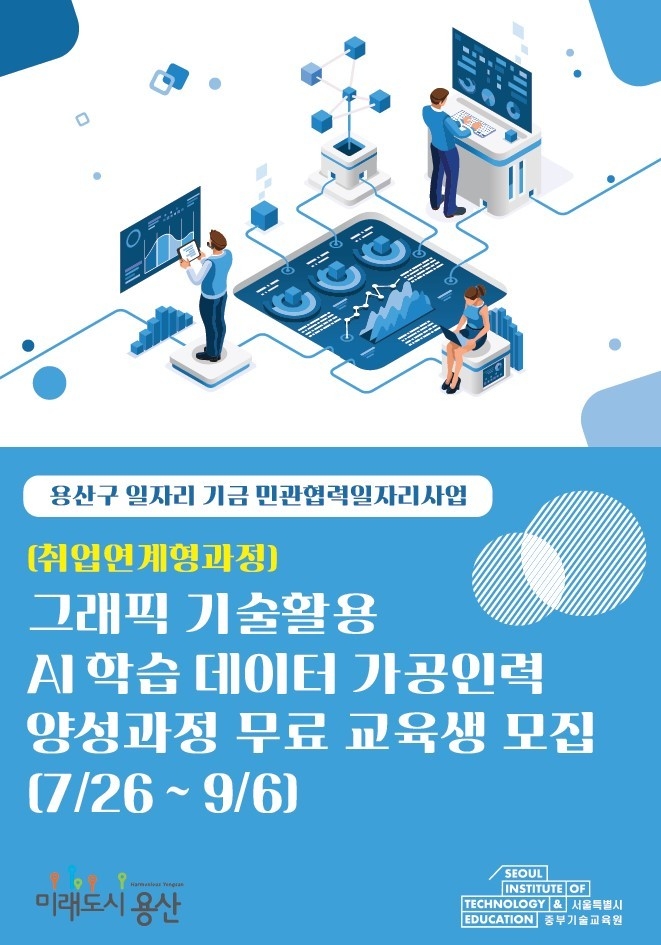 지이코노미 이승현 기자 | 용산구가 민관협력일자리사업의 하나인 AI 학습 데이터 가공인력 양성과정을 무료로 열고 교육생을 모집한다고 3일 밝혔다. 모집대상은 미취업 구민 20명으로, 다음달 6일까지 교육원 홈페이지 또는 교육원에서 접수한 자 중 서류·면접 심사를 거쳐 선발된다.