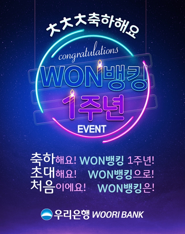 우리은행은 모바일뱅킹 앱 우리WON뱅킹 출시 1주년을 기념해 축하, 초대, 처음의 의미를 담은 ‘ㅊㅊㅊ 이벤트’를 실시한다고 18일 밝혔다.