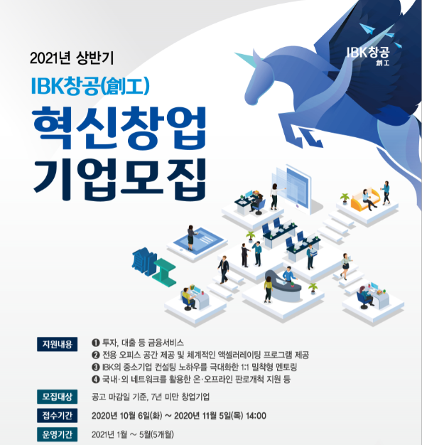 IBK기업은행은 창업육성 프로그램 ‘IBK창공(創工)’의 2021년 상반기 혁신 창업기업 모집을 6일부터 시작한다고 밝혔다.