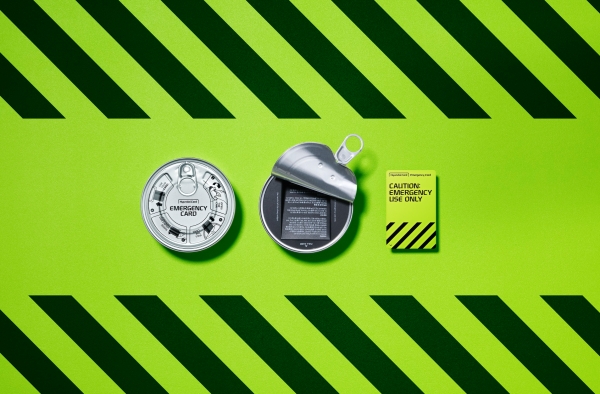 Emergency Card는 위급한 상황에서 사용할 수 있는 1만원이 충전된 선불카드로 재난 구호물품을 연상하게 하는 캔 패키지 속에 밀봉해 제공된다.