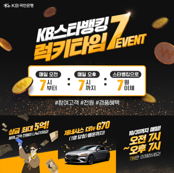 KB국민은행이 오전 7시~오후 7시 사이에 7원을 이체하며 자동 응모되는 '돈 버는 습관, KB스타뱅킹 럭키타임 7' 이벤트를 실시한다.