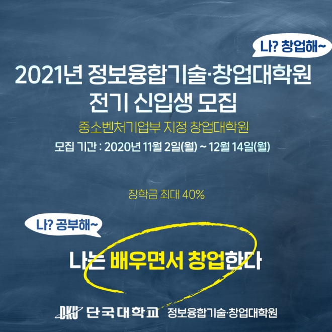 한편, 중소벤처기업부 지원 창업대학에 선정된 단국대학교의 신입생 원서 접수는 11월 2일(월)부터 12월 14일(월)까지 진학사 홈페이지를 통해 가능하다.