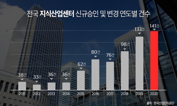부동산 정보제공 업체 경제만랩이 한국산업단지공단의 ‘지식산업센터 현황(2020년 12월 말 기준)’자료를 살펴본 결과 올해 전국 지식산업센터 신규승인 및 변경 건수가 총 141건으로 집계됐다. 이는 한국산업단지공단이 현황 자료를 집계하기 시작한 1997년 이후 가장 높은 수치다.
