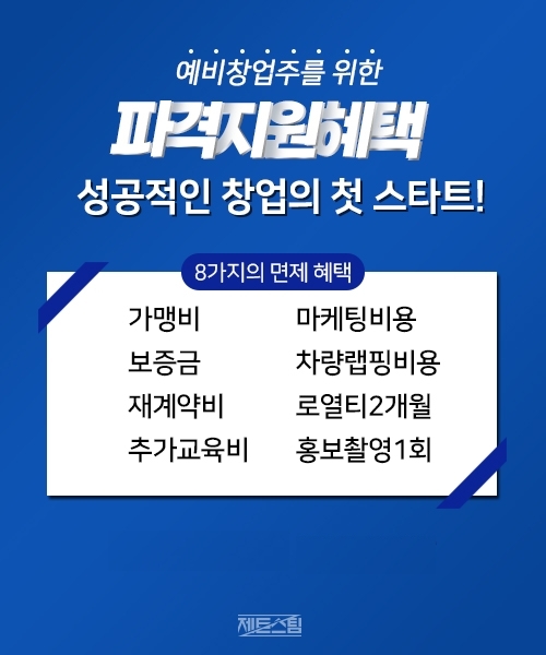 이번 제트스팀이 지원하는 혜택 내용은 가맹비 면제, 차량 랩핑 비용 면제, 보조금 면제, 추가 교육비 면제, 재계약비 면제, 로열티 2개월 면제, 마케팅 비용 면제, 홍보 촬영 1회 진행으로 구성했다.