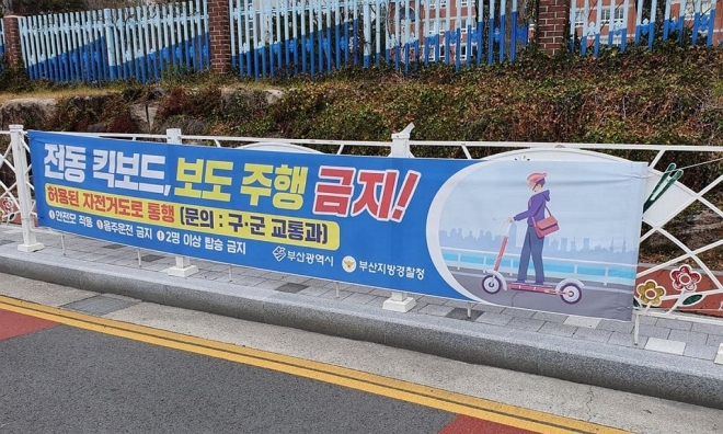 민원에서는, “현행 수영구 조례는 해안가에 설치된 자전거도로에서만 전동킥보드를 운행할 수 없는 것으로 되어 있지만, 현수막에는 마치 모든 전동킥보드 운행이 금지된 것처럼 잘못 안내하고 있다”고 지적했다.