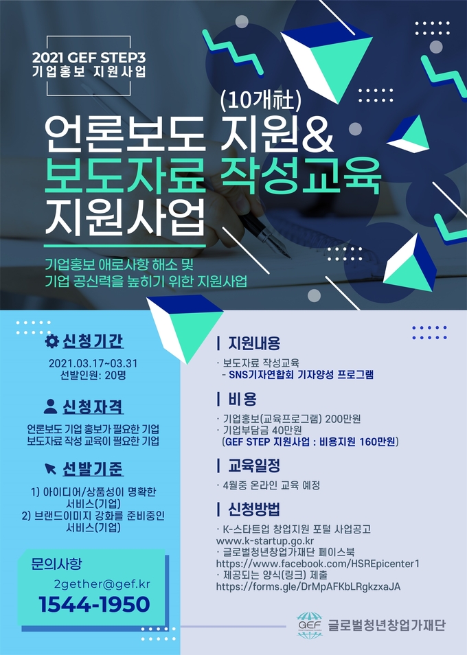 글로벌청년창업가재단(이사장 함성룡, 이하 'GEF')은 STEP(스텝)는 프로그램을 통해 스타트업의 지속 가능케 하기 위한 일환으로 기업홍보 지원사업에 나선다.