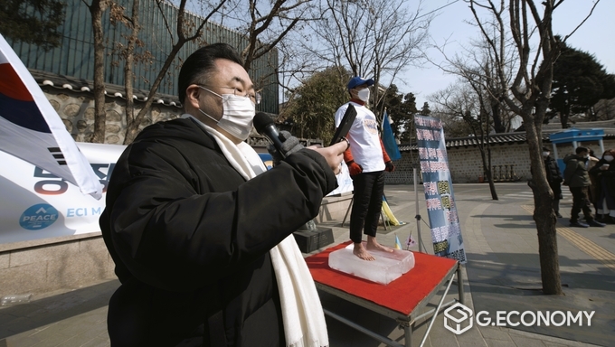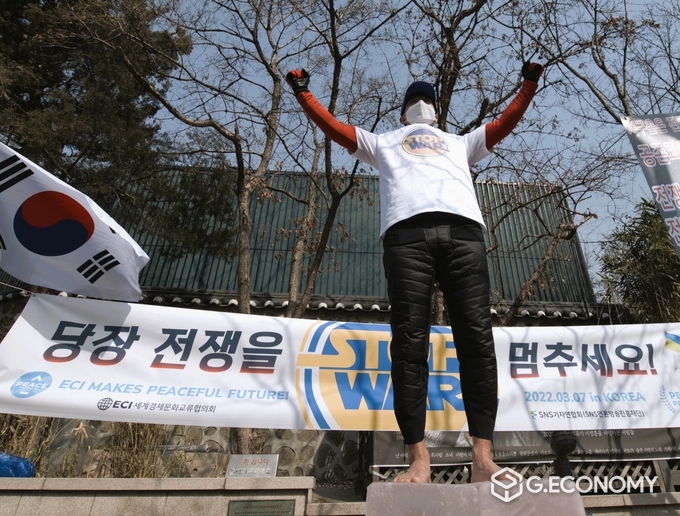 지이코노미 이대희 기자 | 세계경제문화교류협의회(류영준총재)와 SNS기자연합회(SNS언론방송진흥재단 김용두회장) 환경대사인 맨발의 사나이 조승환대사가 2022년 3월 7일 오전11시 러시아대사관 앞에서 STOP WAR(스탑워)를 외친다.