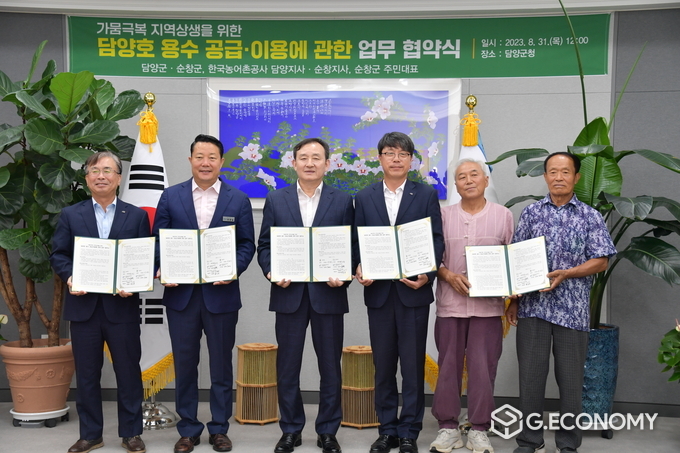 이에 31일 담양군과 순창군, 한국농어촌공사 담양지사와 순창지사, 순창군 구림면 주민대표는 업무협약을 체결하고. 차수벽 철거와 더불어 한해 우심지역인 순창군 금과면에 담양호 하천수 유입 등 상생을 위한 다양한 현안에 협력하기로 했다.