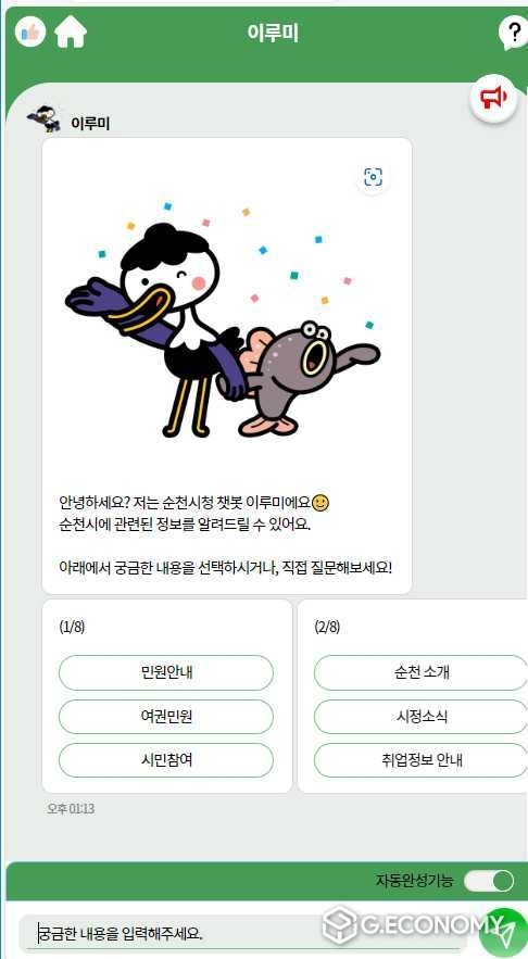 지이코노미 양하영 기자 | 순천시(시장 노관규)가 시민불편 해소를 위한 민원상담 온라인 창구인 인공지능(AI) 챗봇 서비스를 제공한다고 밝혔다.
