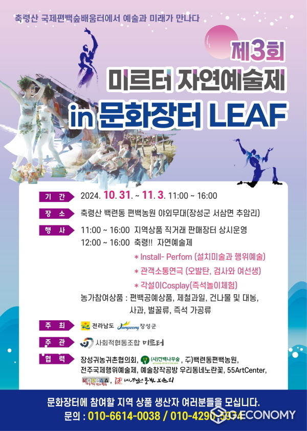 지이코노미 김정훈 기자 | 전남 장성군 축령산에서 펼쳐지는 ‘미르터 자연예술제’가 오는 31일부터 11월 3일까지 국제편백숲배움터 하모니센터에서 개최된다.