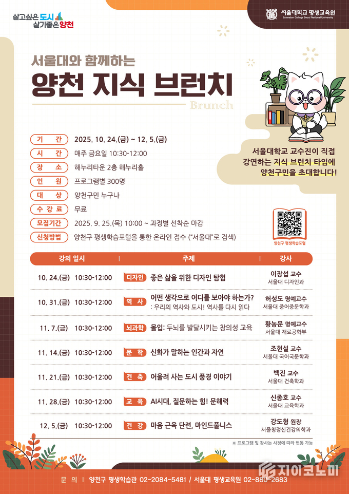 - 서울대 교수진과 함께하는 ‘양천 지식 브런치’, 10/24~12/5 매주 금요일 진행