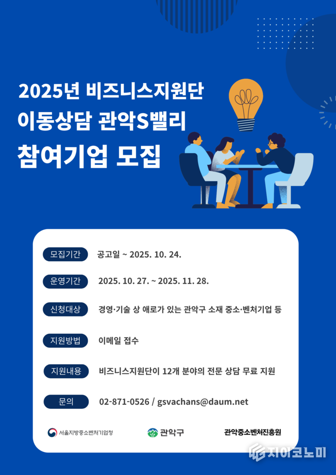 지이코노미 최영규 기자 | 관악구(구청장 박준희)가 관악중소벤처진흥원과 서울지방중소벤처기업청이 협력하여 관내 창업기업의 애로사항 해소와 성장지원을 위한 '2025년 관악S밸리 비즈니스지원단 이동상담‘을 운영한다.