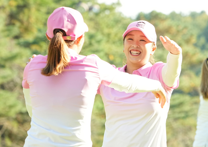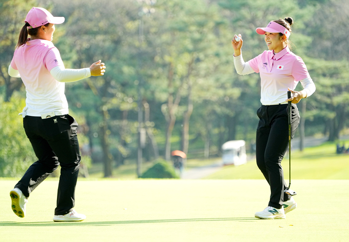 일본팀의 야마시타 미유(왼쪽)와 사이고 마오가 18번 홀 버디 퍼트가 성공하자 환하게 웃으며 포옹하는 동작을 하고 있다