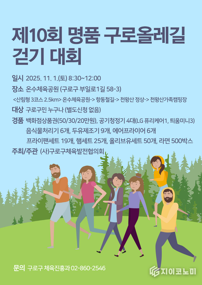 지이코노미 최영규 기자 | 사단법인 구로구체육발전협의회(회장 김홍수)가 주최, 주관하고 구로구(구청장 장인홍)가 후원하는 ‘제10회 명품 구로올레길 걷기 대회’가 11월 1일 오전 8시 30분 온수체육공원에서 개최된다.