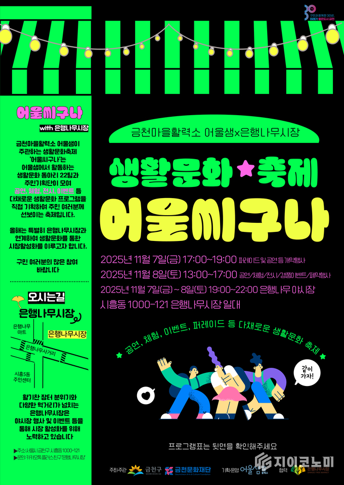 지이코노미 최영규 기자 | 금천문화재단(대표이사 서영철)은 11월 7일부터 8일까지 금천마을활력소 어울샘에서 주민과 상생하는 생활문화축제 ‘어울씨구나‘를 개최한다고 밝혔다.