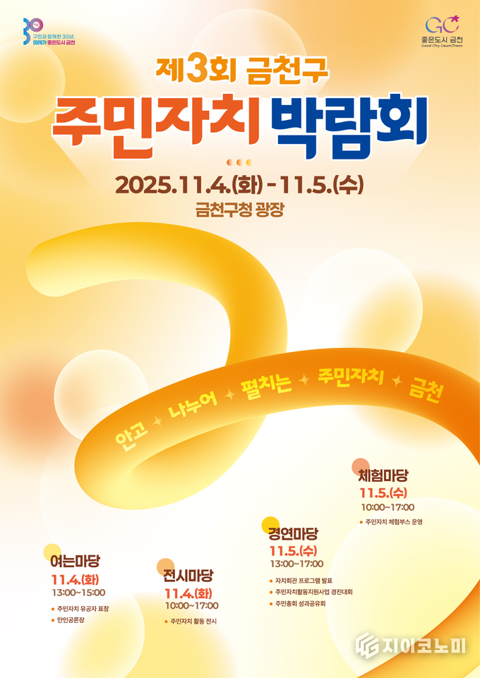 지이코노미 최영규 기자 | 금천구(구청장 유성훈)는 풀뿌리 민주주의 가치 확산을 위해 오는 11월 4일과 5일 양일간 금천구청 광장 일대에서 ‘금천구민 만인공론장’과 ‘제3회 주민자치박람회’를 개최한다고 밝혔다.