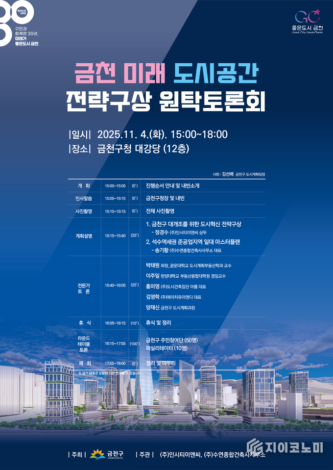지이코노미 최영규 기자 | 금천구(구청장 유성훈)는 4일 오후 3시 금천구청사 12층 대강당에서 ‘금천의 미래 도시공간 전략구상 계획 수립을 위한 원탁토론회’를 연다고 밝혔다.