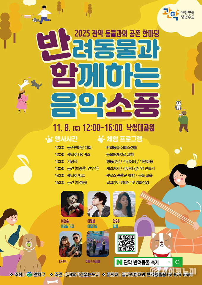 지이코노미 최영규 기자 | 관악구(구청장 박준희)가 오는 11월 8일(토) 낙성대공원에서 반려동물 문화축제 ‘2025 동물과의 공존 한마당’을 개최해 올바른 반려동물 돌봄 문화 확산과 동물복지 향상에 힘쓴다.