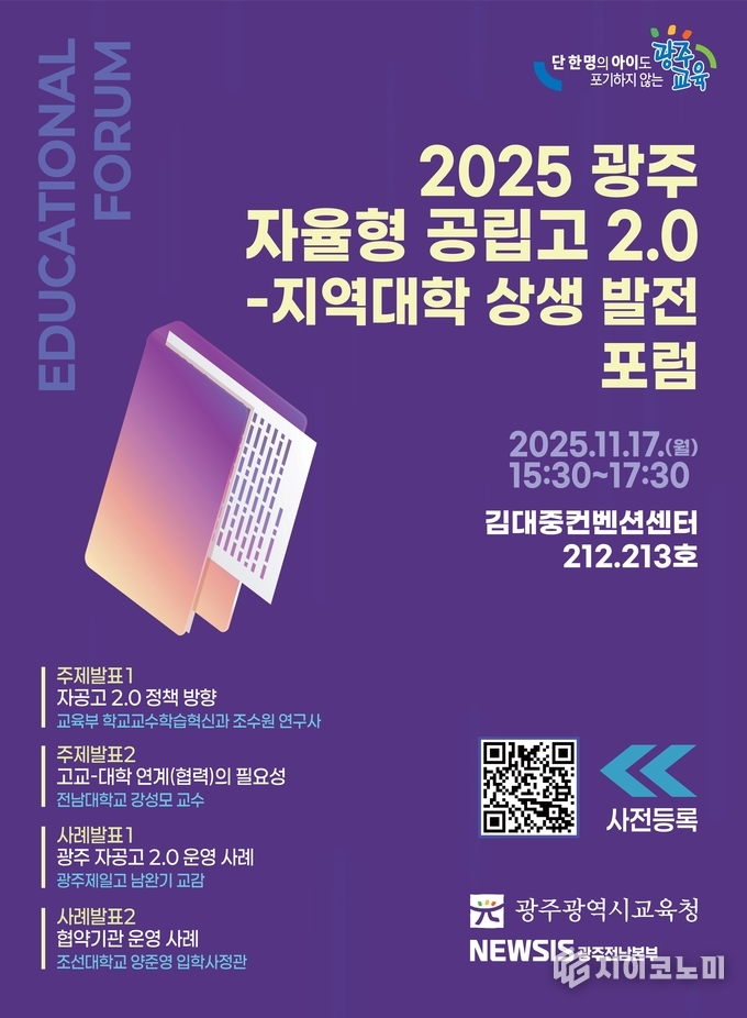 지이코노미 한정완 기자 | 광주시교육청(교육감 이정선)은 오는 17일 김대중컨벤션센터에서 ‘2025 광주 자율형 공립고 2.0 발전 방안 포럼’을 개최한다.