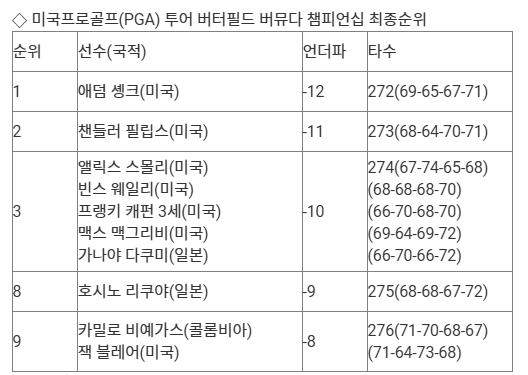 셍크는 17일(한국시간) 버뮤다 사우샘프턴의 포트 로열 골프코스(파71·6,828야드)에서 열린 PGA 투어 버터필드 버뮤다 챔피언십(총상금 600만 달러) 마지막 날 4라운드에서 버디 1개, 보기 1개로 이븐파 71타를 쳐 최종 합계 12언더파 272타로 우승했다.