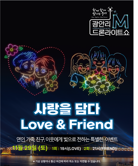 이번 공연은 지난 8~9월 진행한 “광안리 M 드론라이트쇼, 사랑을 담다” 사연 공모전에서 선정된 4개의 사연 중 연인과 친구에게 보내는 사연을 토대로 구성됐다.