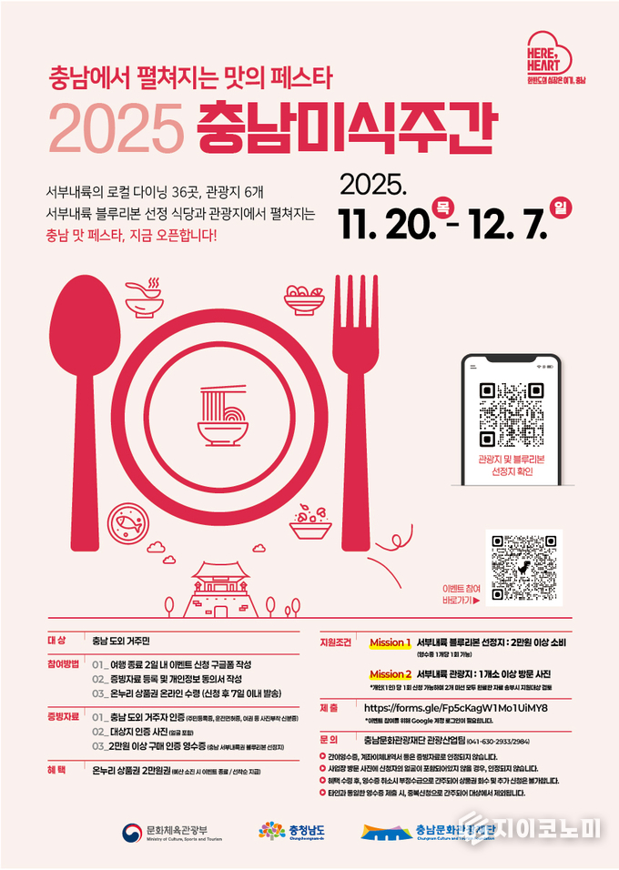 이 기간 동안 충남 외 지역 거주민이 선정된 식당과 관광지 1곳 이상을 방문하고 이벤트에 응모하면 1인당 온누리상품권 2만 원권이 제공된다. 자세한 내용은 충남문화관광재단 홈페이지에서 확인할 수 있다.