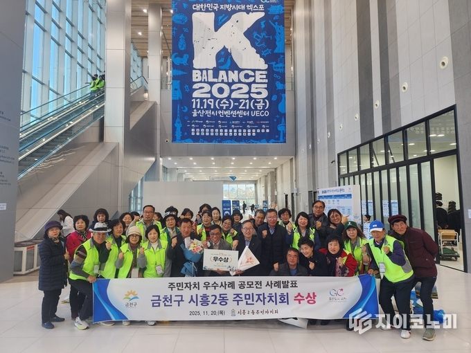 지이코노미 최영규 기자 | 금천구(구청장 유성훈)는 시흥2동 주민자치회(회장 마은준)가 11월 20일 울산광역시 UECO에서 열린 ‘지방자치 30주년 기념 주민자치 우수사례 공모전’ 학습공동체분야에서 '우수상'을 수상했다고 밝혔다.