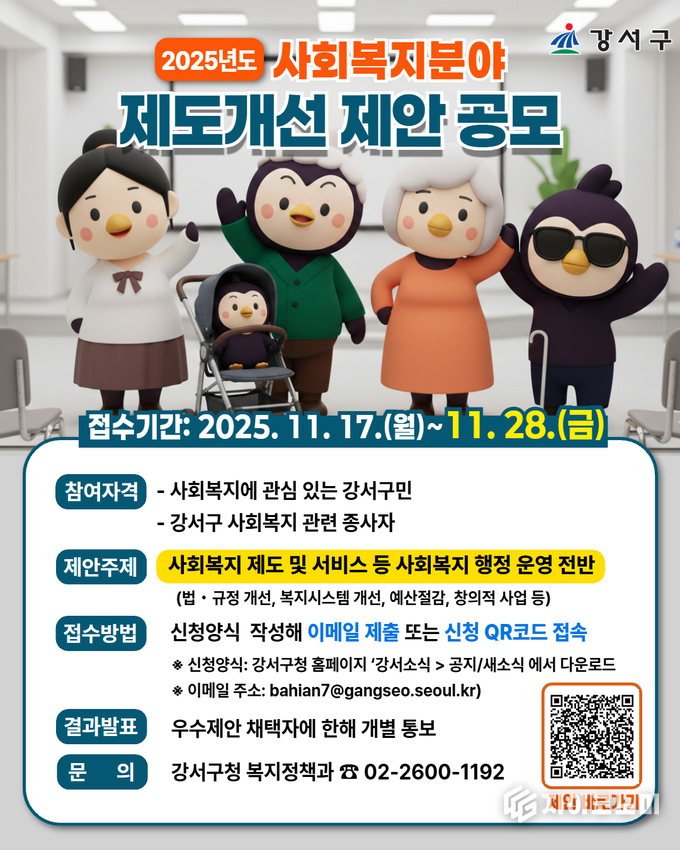 지이코노미 최영규 기자 | 서울 강서구(구청장 진교훈)는 오는 28일(금)까지 ‘2025년 사회복지분야 제도개선 제안 공모’를 진행한다고 밝혔다.